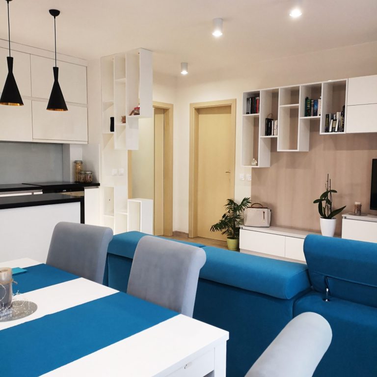 Цветовете са студени, основните линии са модерни, но въпреки това, стаята е уютна и приветстваща. Проектирах я, както рисувам картина и точно това се получи, спалня, чиято снимка да си окачиш на стената 😉